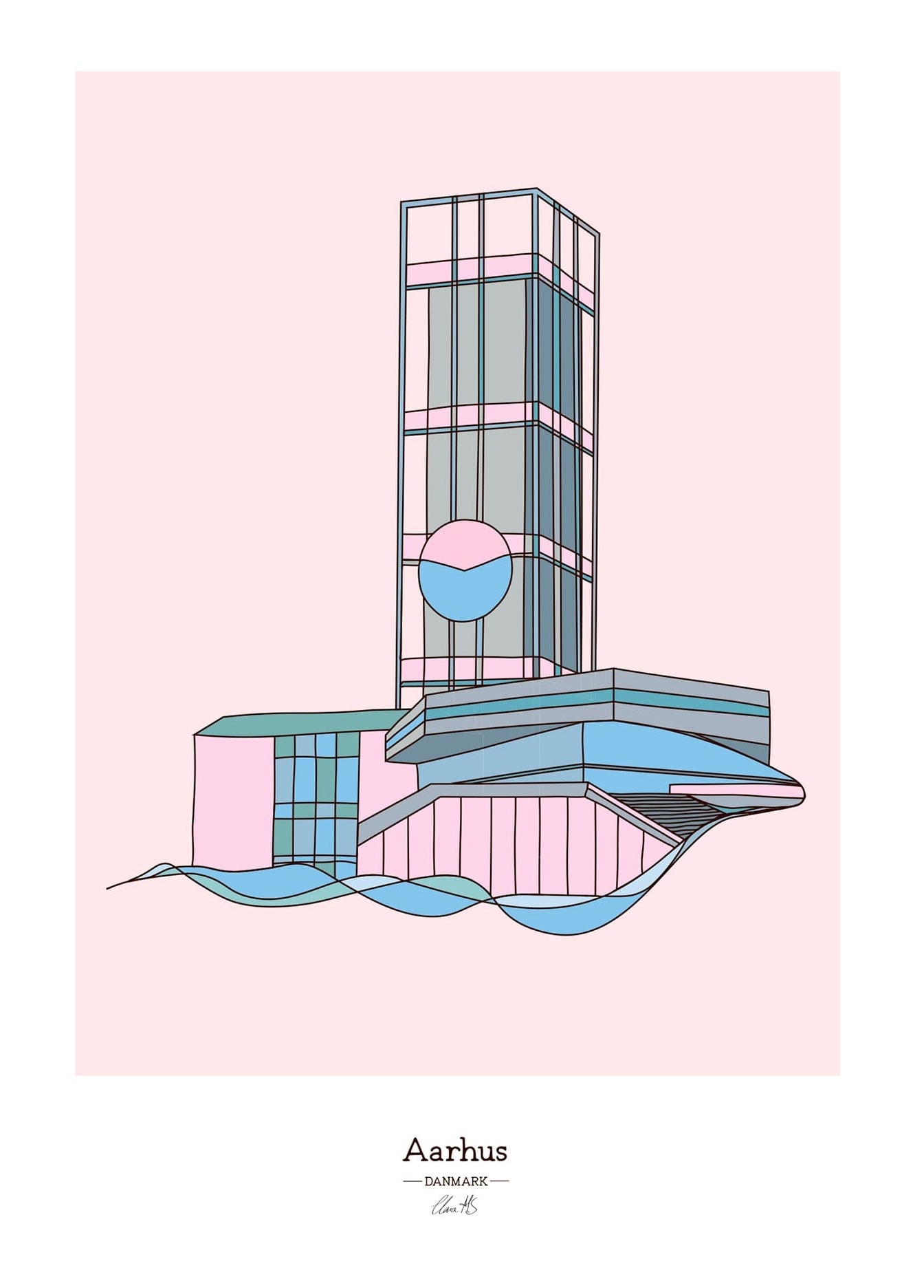 Enkel og fin Aarhus plakat i lyserød og lyseblå. På plakaten ses nogle af byens store arkitektoniske kendetegn såsom Dokk1 og Rådhustårnet.