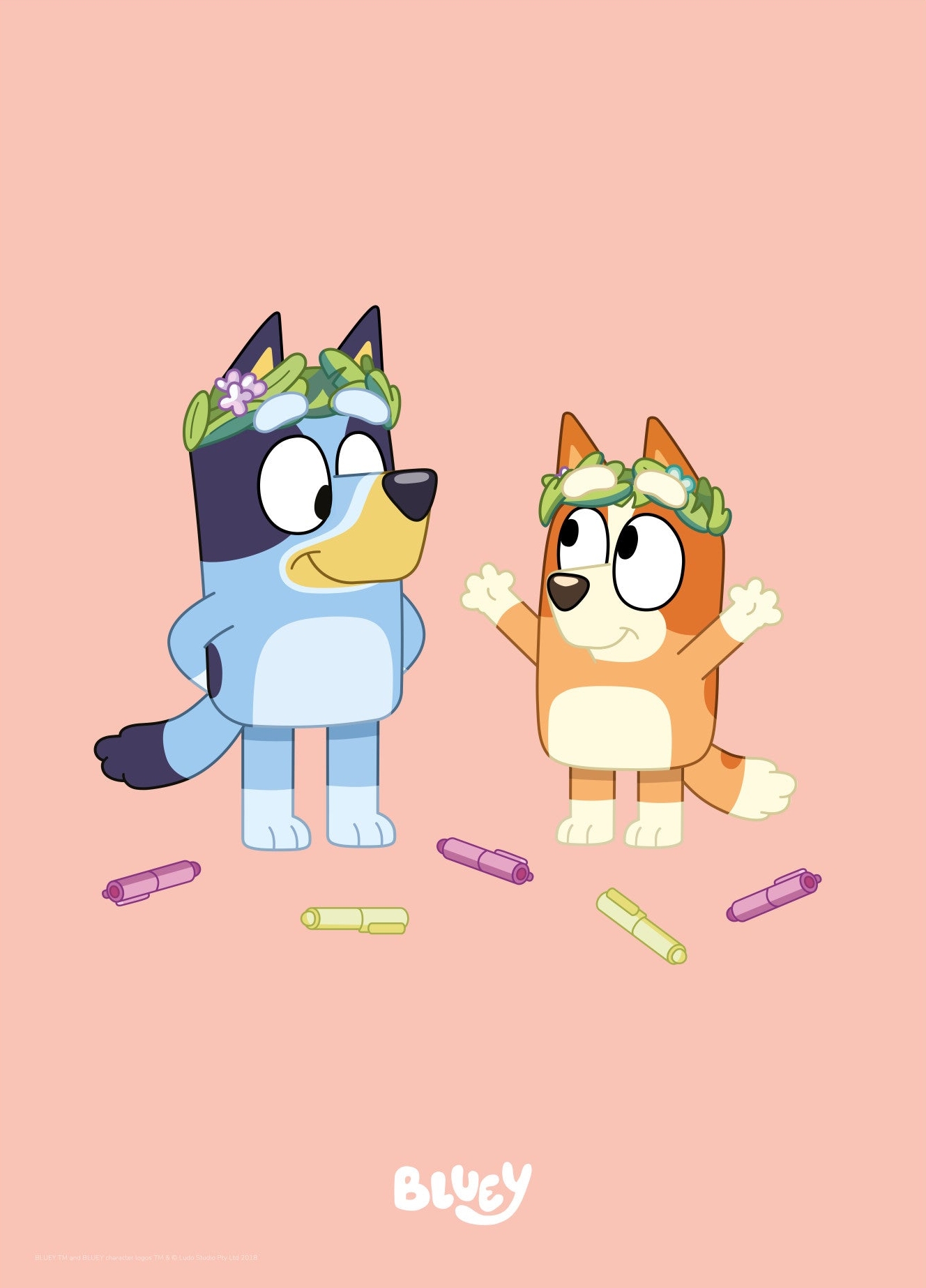 Bluey plakat med Bluey og Bingo, der leger med farvekridt.