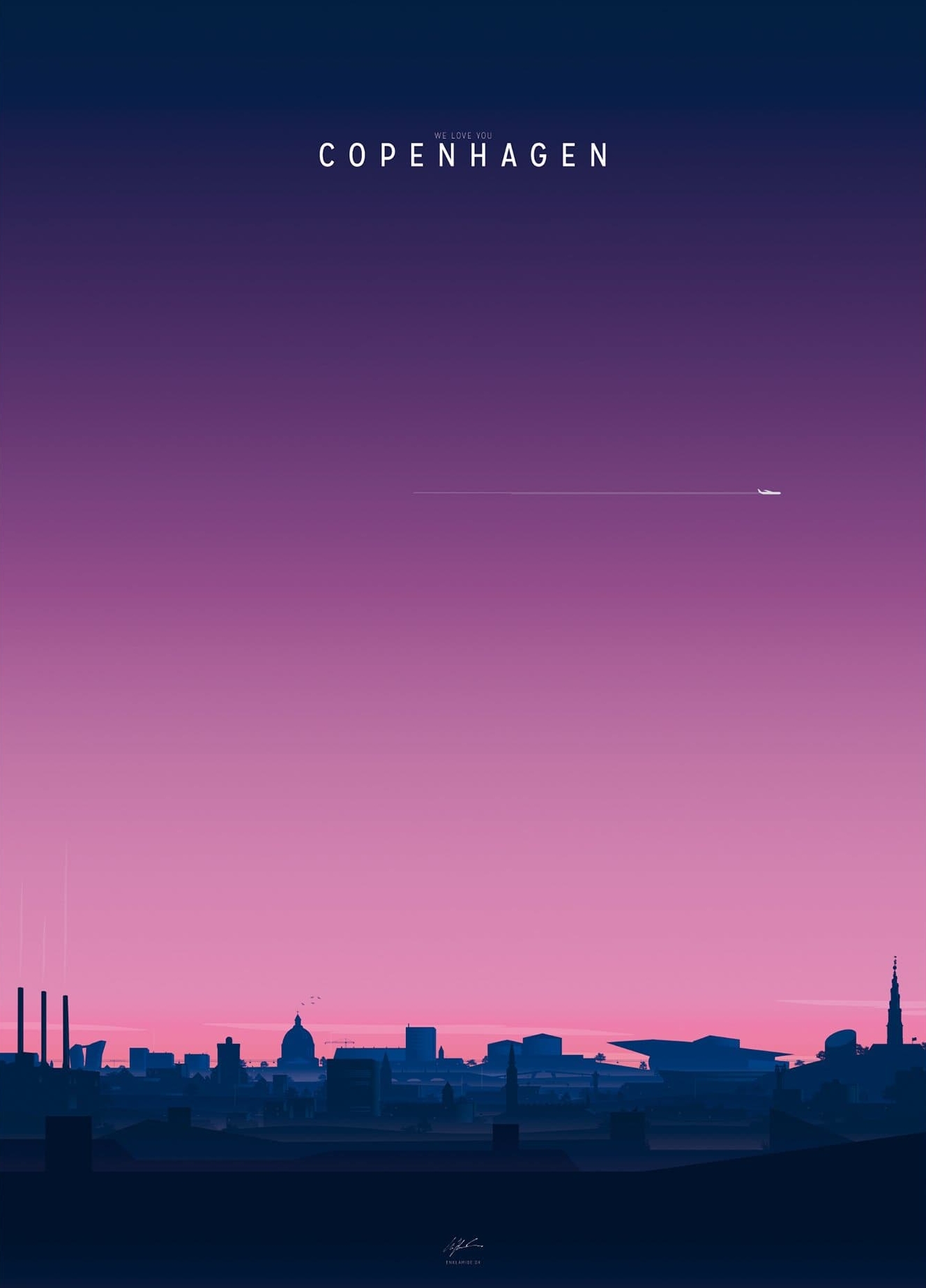 København plakat med en smuk lyserød aftenhimmel over byens skyline.