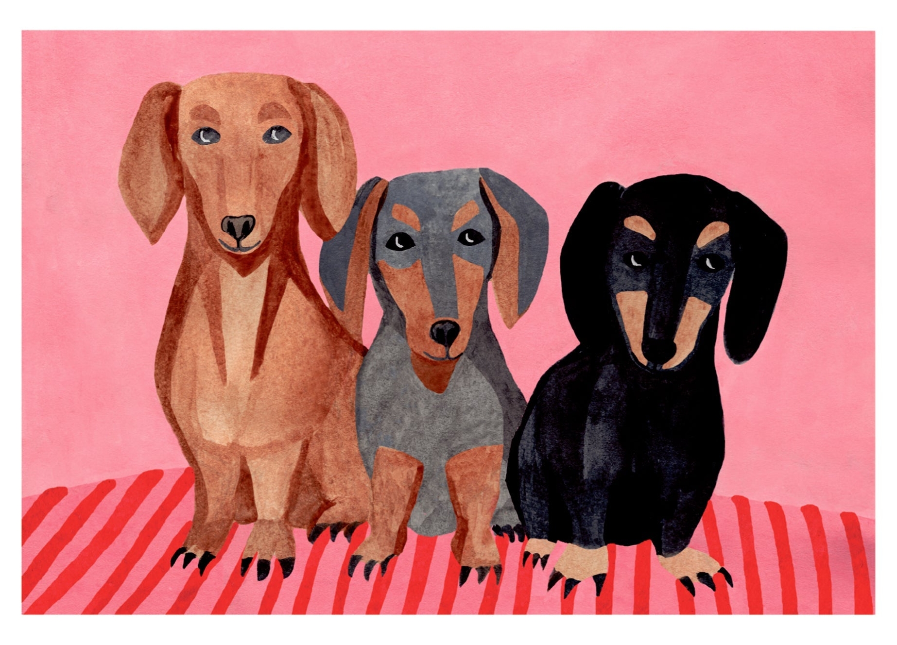 Iga Kosickas farverige og charmerende hunde plakat “Dachshunds”. På plakaten ses 3 skønne gravhunde i hver deres farve og med hver deres personlighed.