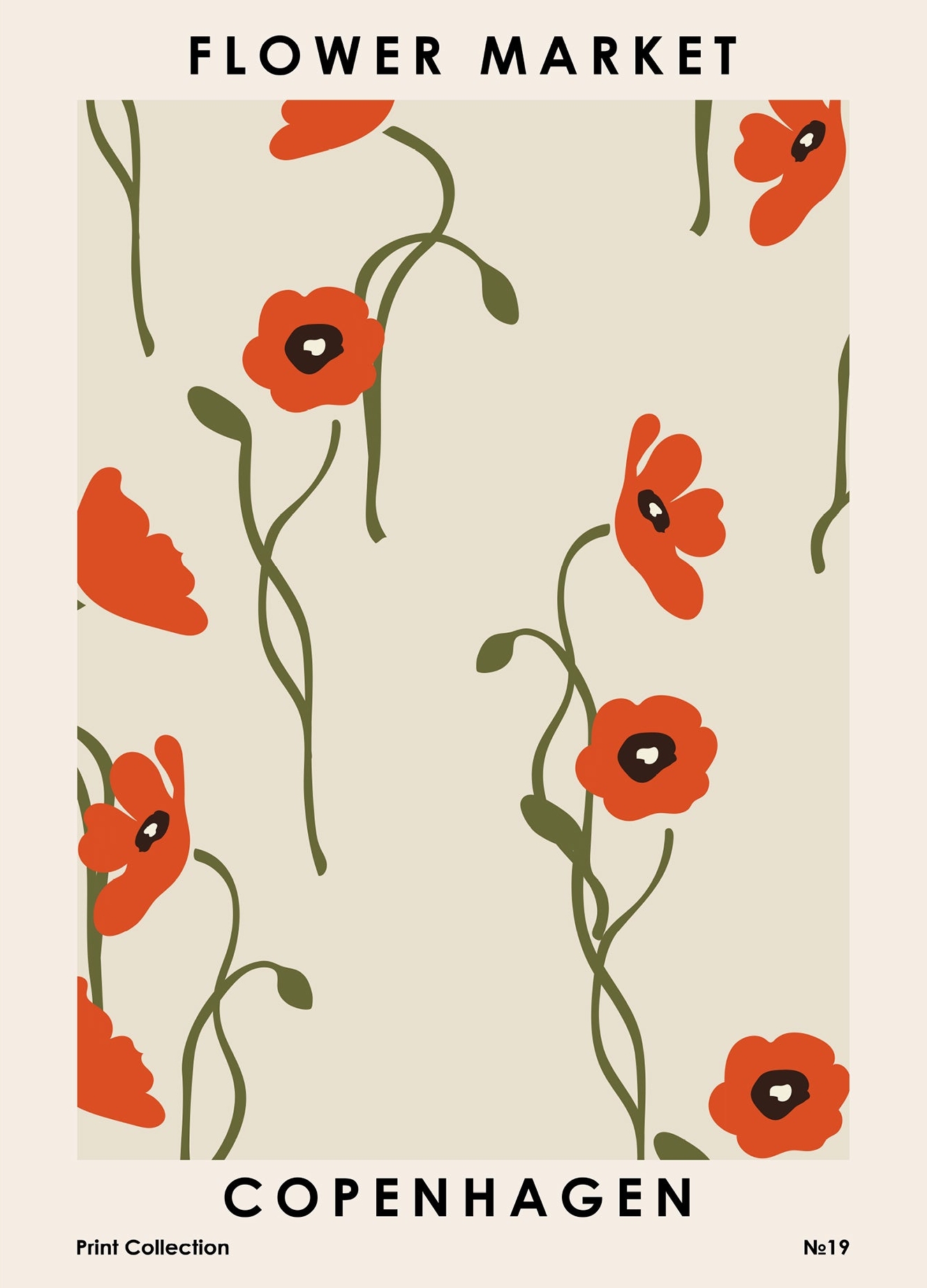 Københavner plakat med et smukt mønster af røde valmuer på en beige baggrund.