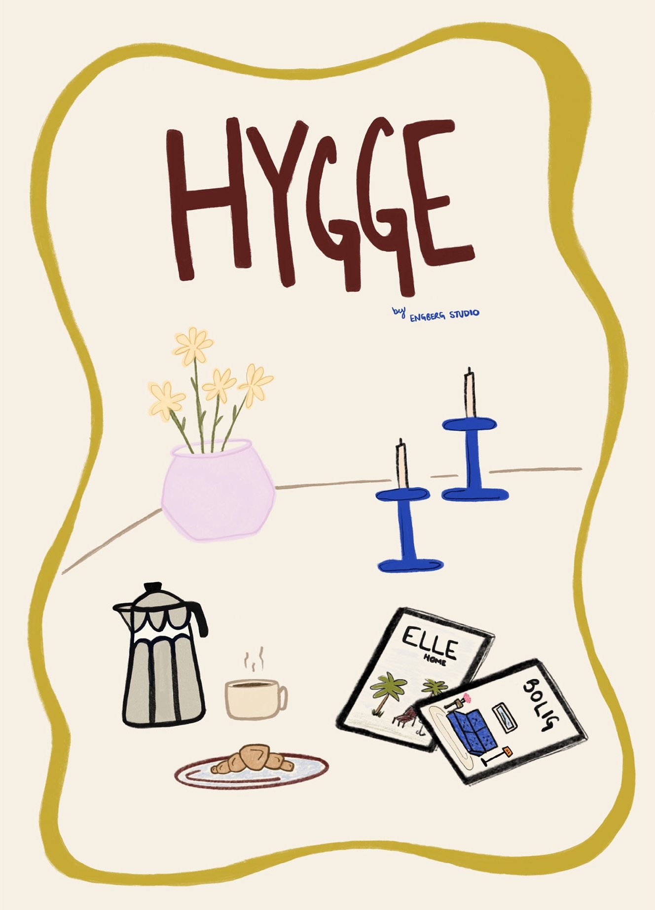 Hygge plakat med kaffe, croissant, stearinlys, magasiner og en buket blomster. Den hyggelige scener er indrammet af en fin, organiske ramme i gul.