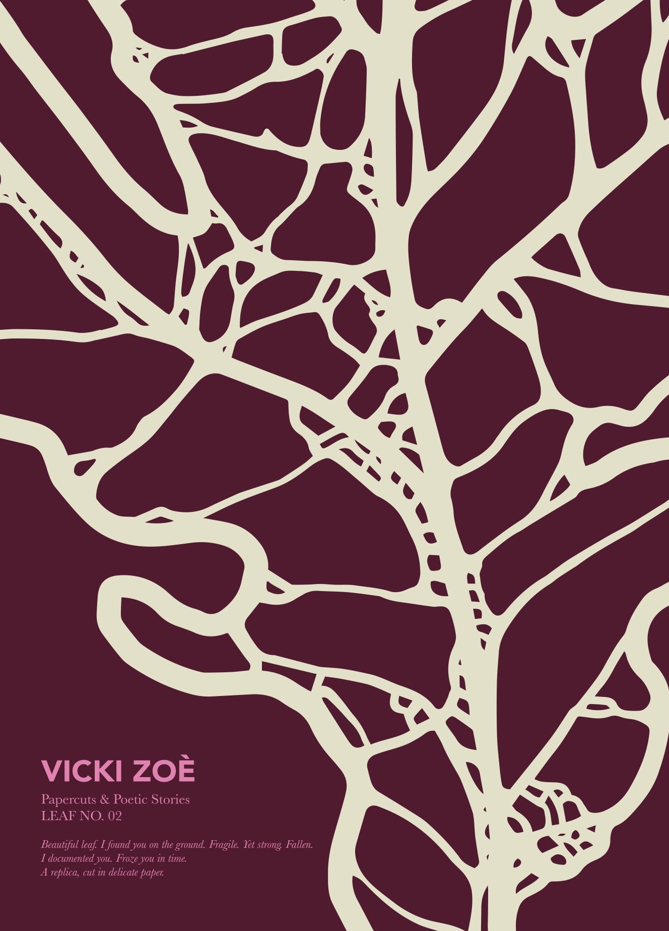 Vicki Zoe plakat med abstrakt motiv inspireret af bladenes mønstre. Motivet er lavet i en cremefarvet hvid, der står i smuk kontrast til den mørke bordeaux og den lyserøde tekst.