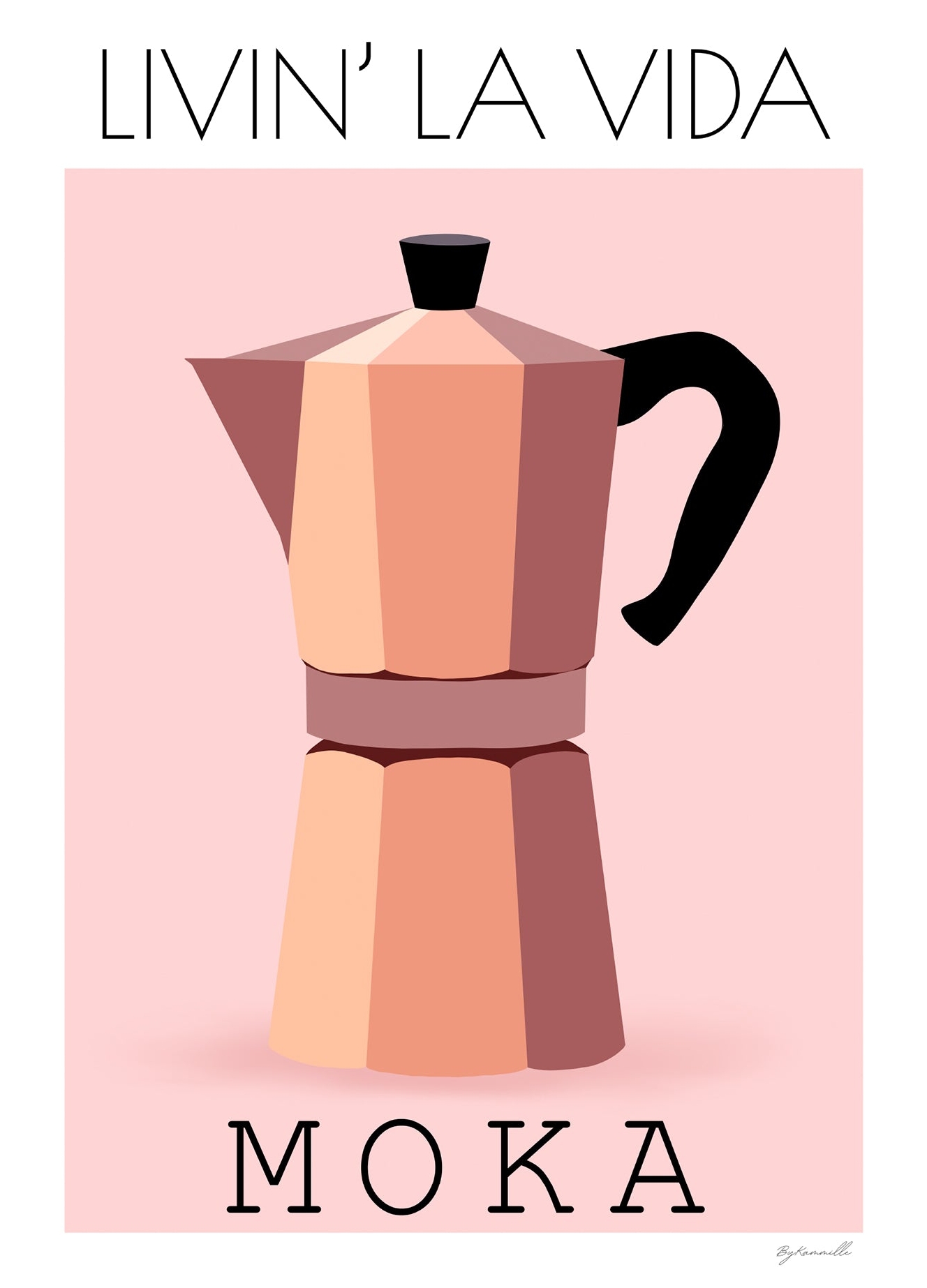 Lyserød kaffe plakat med en kande filterkaffe og et sjovt citat. Citat spiller på sangtitlen “Livin’ la Vida Loca” af Rickey Martin fra 1999.