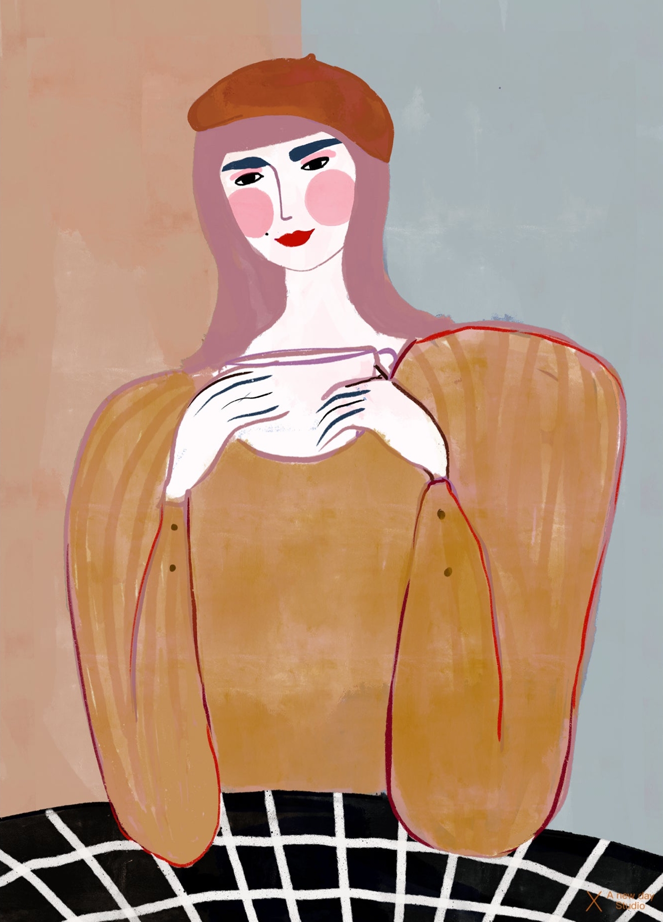Farverig plakat med en kvinde, der sidder med sin kop kaffe. Måske sidder hun på en fransk fortorvscafé. Baretten og det mønstrede cafébord leder i hvert fald tankerne hen på Paris.