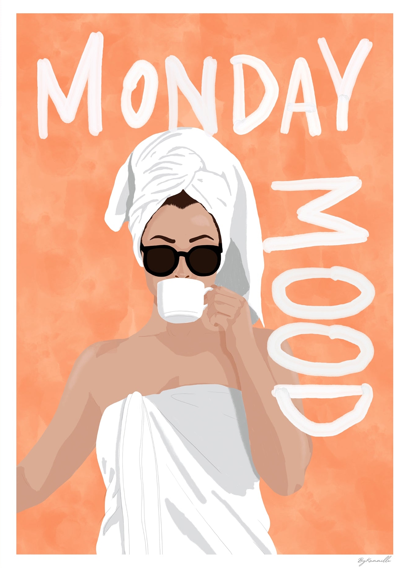 Sjov og selvironisk ByKammille plakat, der forestiller en mandagsscene, hvor man har lidt svært ved at komme i gang.