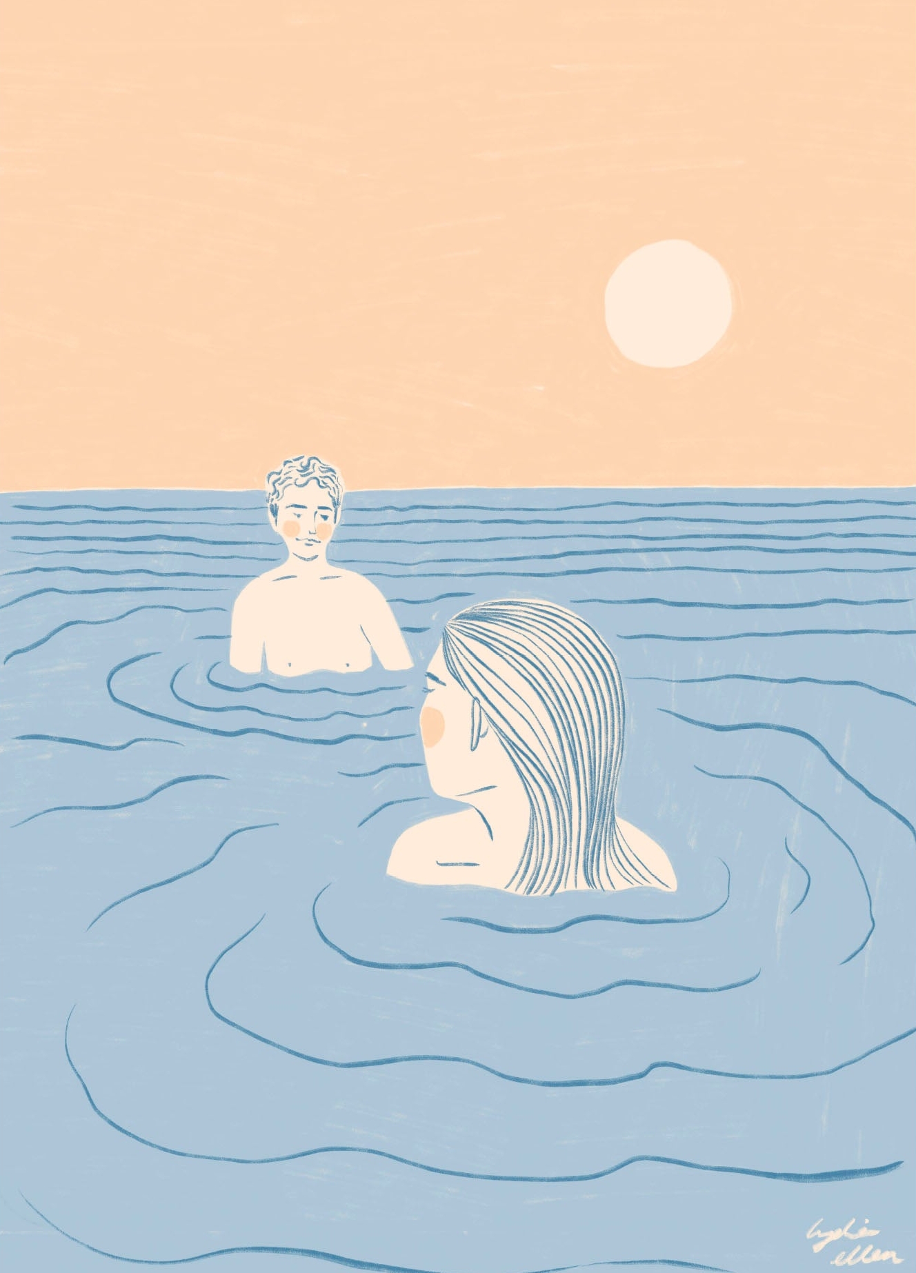 På den fine hav plakat ses en mand og en kvinde, der er ude at bade under den orange solnedgang.