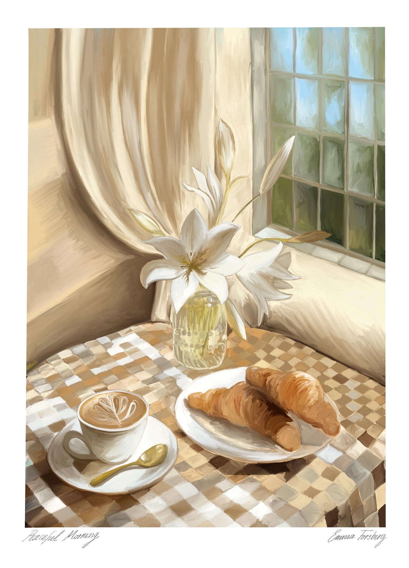 En dejlig morgenscene med croissanter, blomster og kaffe skabt af Emma Forsberg.
