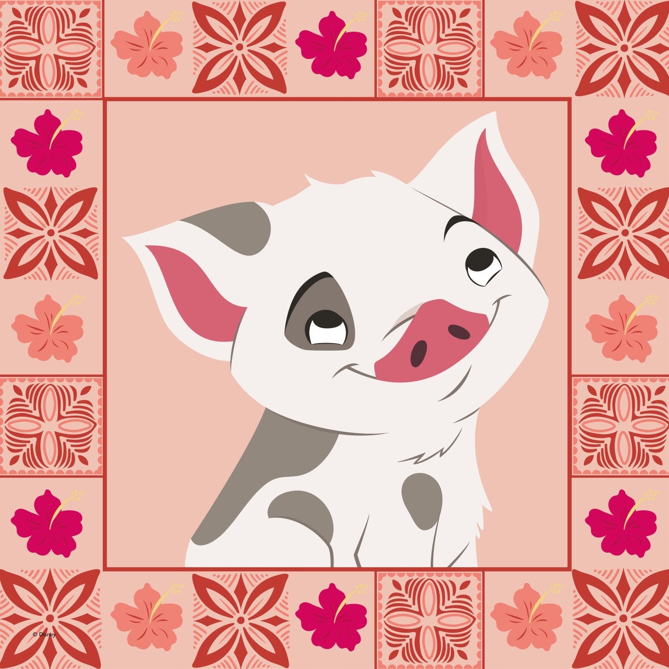 Lyserød Vaiana plakat med grisen Pua, der sidder i en smuk blomstermønstret ramme.