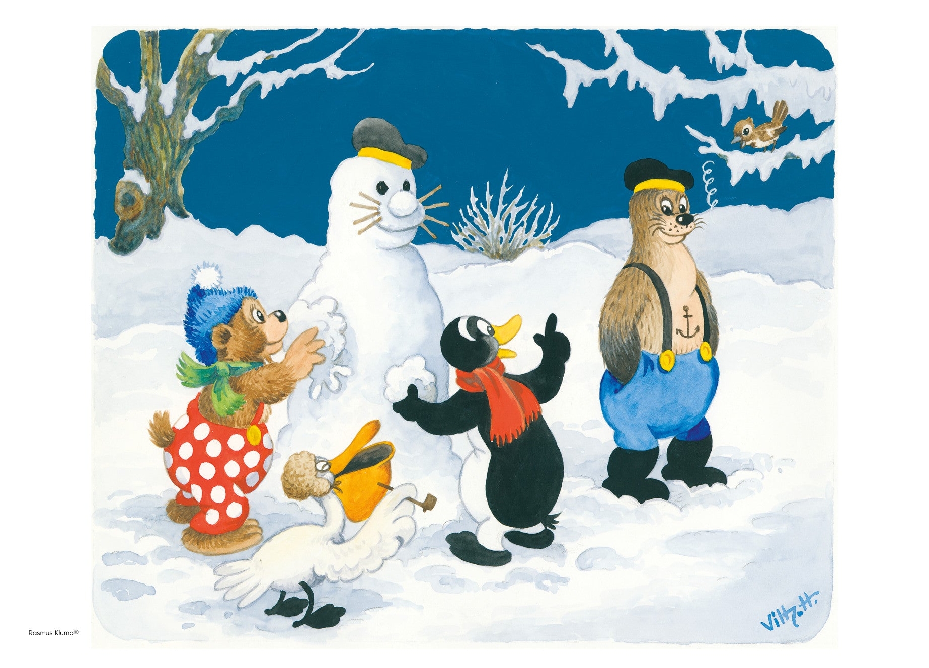 Rasmus Klump plakat med Rasmus og hans venner Pelle, Pingo og Skæg, der leger i sneen.