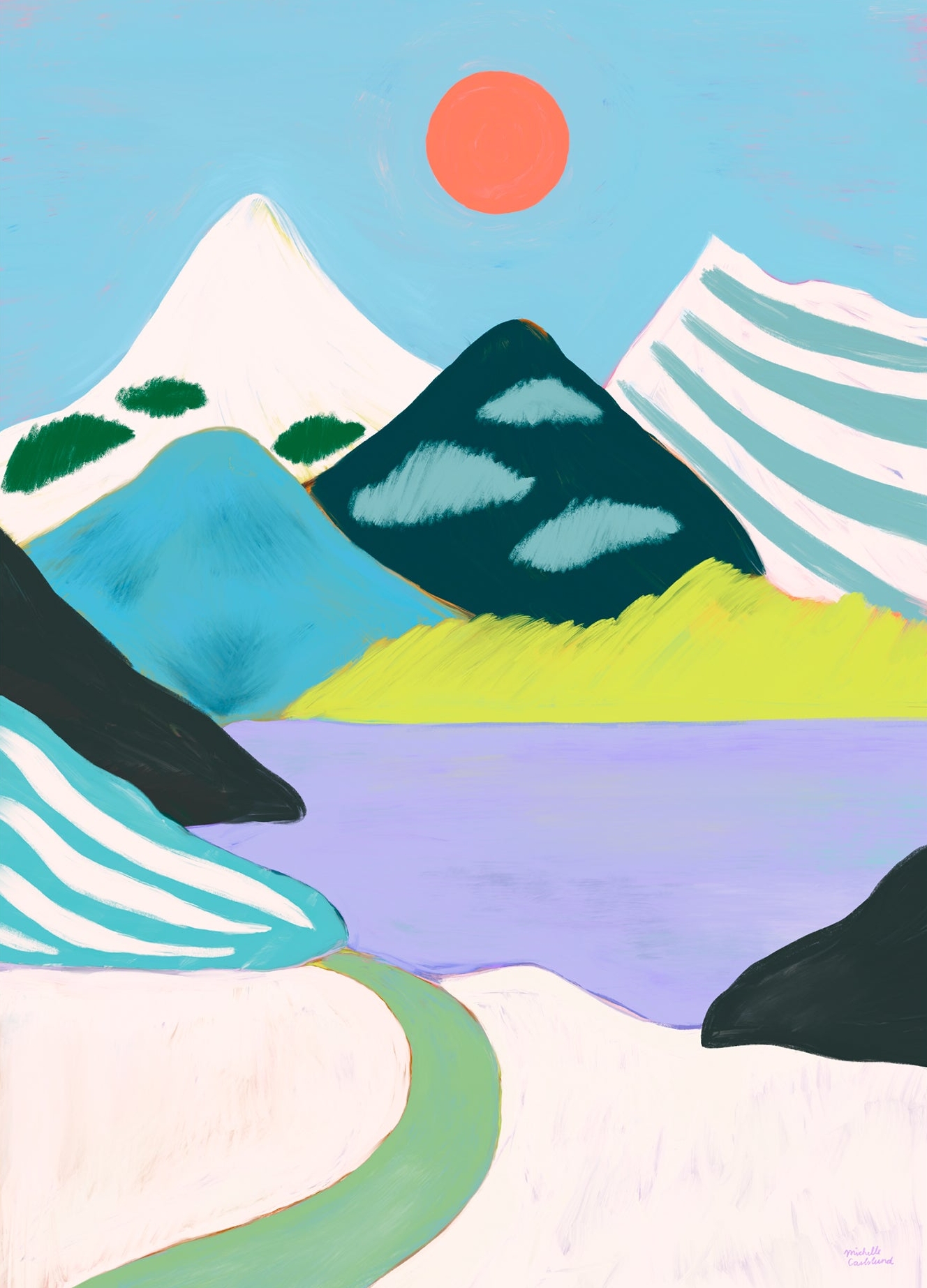 Michelle Carlslund plakat med et bjergrigt snelandskab i turkis, grøn, lilla og beige.