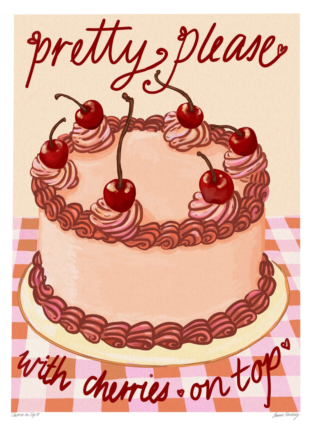 På plakaten ses en overdådig og virkelig indbydende lagkage med kirsebær på toppen.